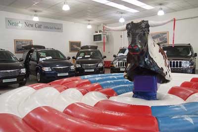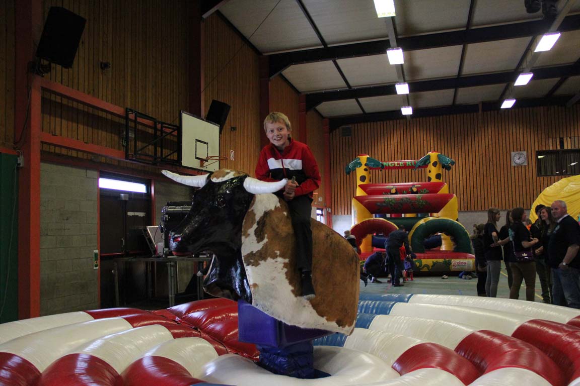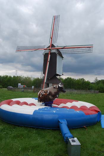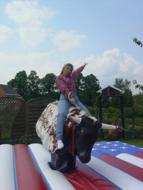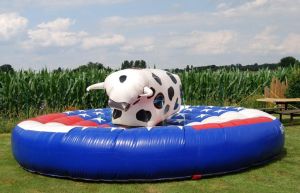 ![]() Voor de allerkleinsten, onze reuze opblaasbare stier Heel leuk en heel veilig ! Een opblaasbare rodeostier: Het ultieme plezier voor ieder kind en volwassene. Deze stier heeft een veilig springkussen van 5,5 meter diameter. De rodeostier is volledig opgeblazen. De kinderen vinden het een uitdaging om zo lang mogelijk op de stier te blijven zitten zolang er rondom hen gespeeld en geduwd wordt. |